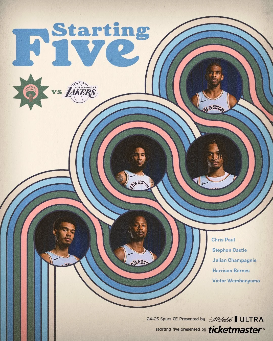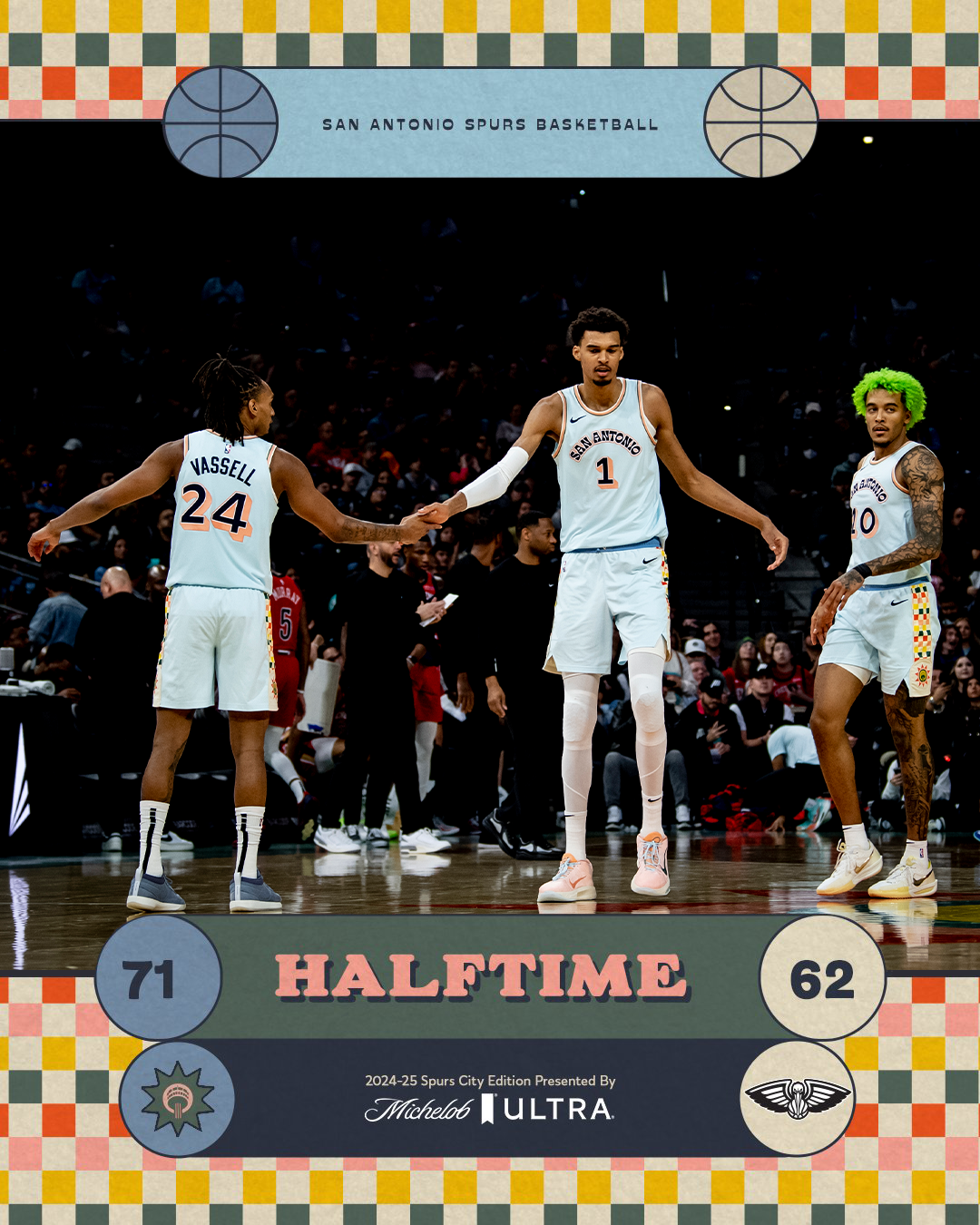A bold departure from the Spurs traditional silver and black colorway, each uniform features a vibrant palette, a new logo and wordmark, and midcentury modern elements, weaving storytelling with innovation and design to reflect the Spurs’ past, present, and future through the lens of basketball.