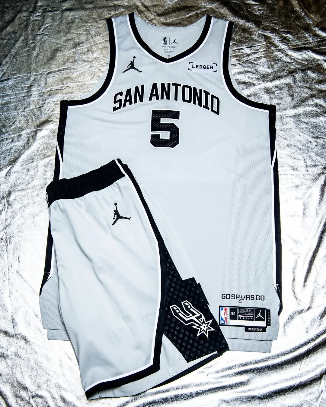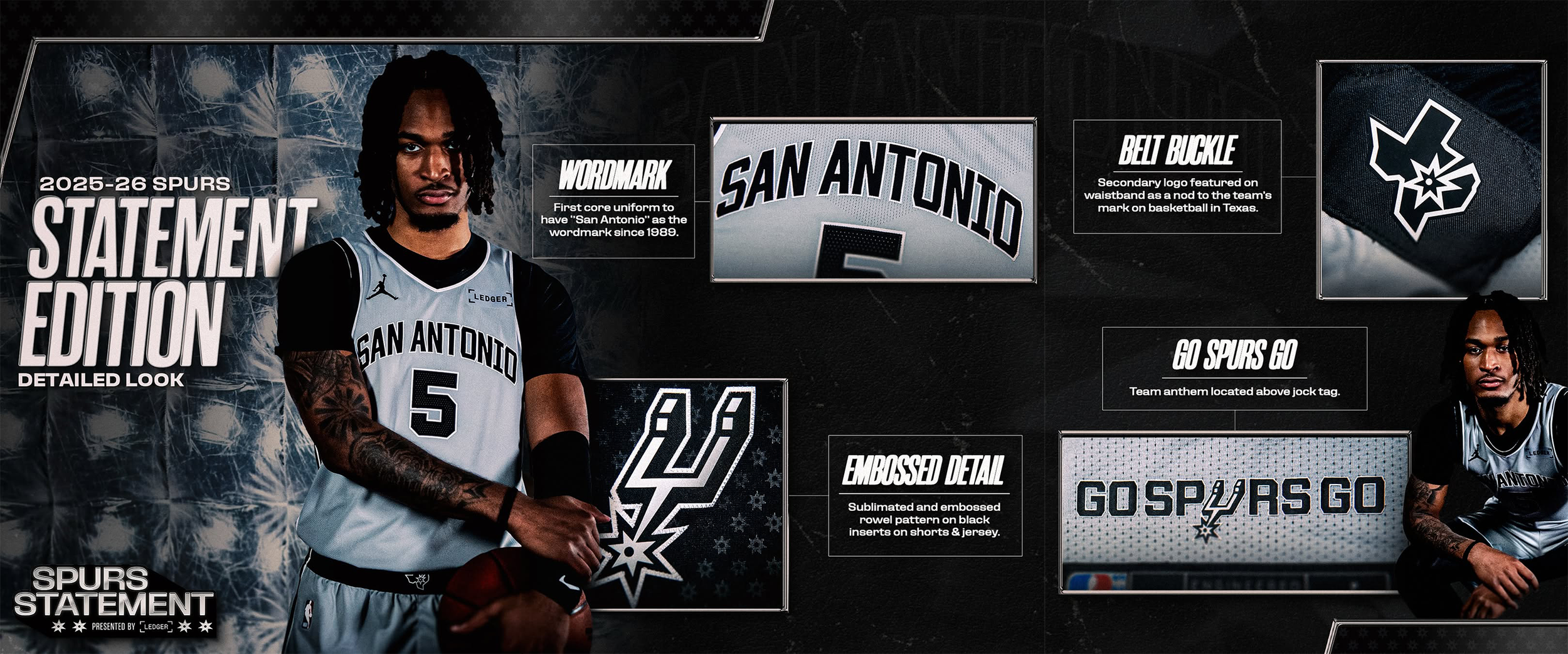 Silver is back. The Spurs Statement Uniform reintroduces the franchise’s iconic silver in a bold yet refined evolution. With “San Antonio” replacing “Spurs” across the chest as a tribute to the city that defines the franchise, the uniform honors tradition while modernizing it through nuanced textures, tonal depth, and a subtle integration of the rowel throughout the design. Leading creative direction for the uniform design and launch campaign, featuring 2025 NBA Rookie of the Year Stephon Castle as the face of this new chapter, the Statement Uniform is a symbol of a future-forward Spurs brand where heritage and progression move as one.